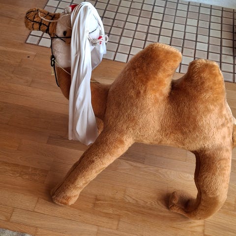 Pieni koriste-esine, joka esittää kamelia. Esine on koristeltu eri värein ja materiaalein, ja se on tarkoitettu sisustukseen tai keräilyyn.