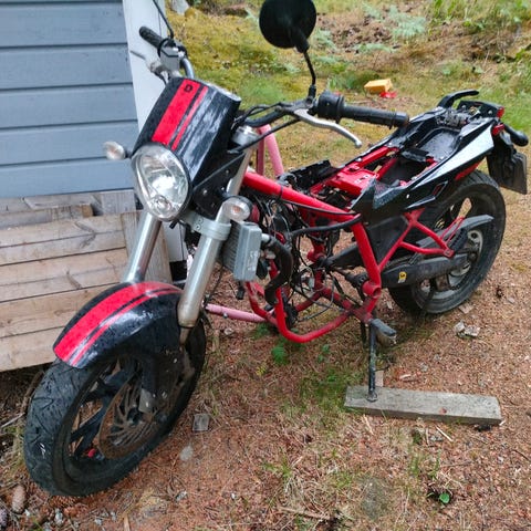Etulokari 1kpl. (musta), Kytkinkahva & Peilit (toinen peili uusi ja käyttämätön), Pakoputki, Takajarrupoljin,