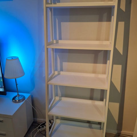 Hyllyt puuta ja runko metallia. Hyllyssä renkaat. Pieni käytön jälki ylimmässä hyllyssä.