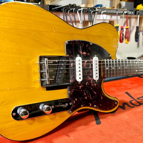 Perinnehenkinen tele alnico -mikeillä ja vintage -tyylin virittimillä. Kielet lähtee tallasta, eli ei läpi rungon. Plussana individuaalit tallapalat, eli ei kompromissejä intonaation suhteen ja paino. En ole punninnut, enkä osaa sanoa, mikä on puulaji, mutta mukavan kevyt kitara on.