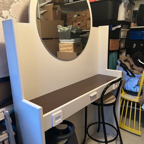 Myydään ylimääräisenä vanha täysipuinen meikkipöytä. Peili on irrotettava, kiinnitys siipimuttereilla. Peilin mitat; leveys 53 ja korkeus 102. Penkki tulee mukana. Verhoilu moitteettomassa kunnossa.