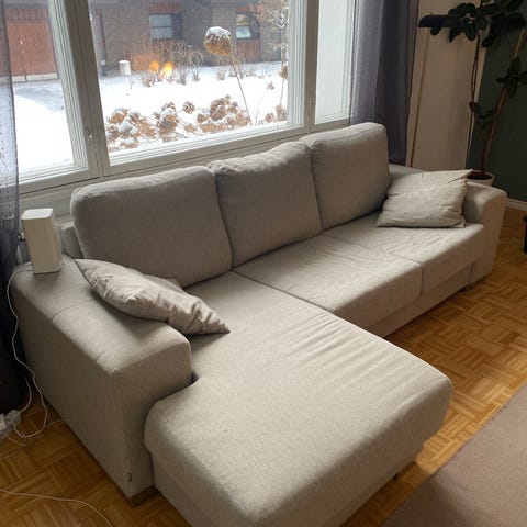 Ostettaessa kangas vaihdettu laadukkaampaan. Selkänojan päälliset irrotettavissa ja pestävät. Divaanin pituus 182cm.