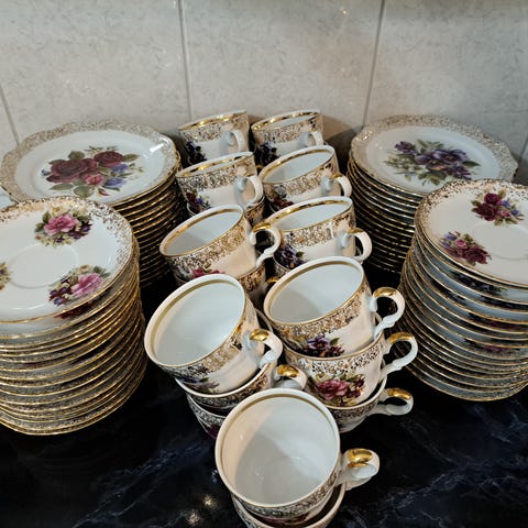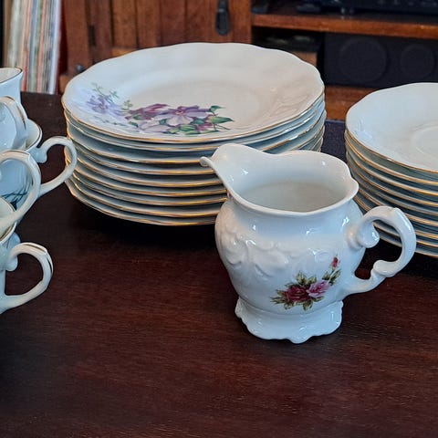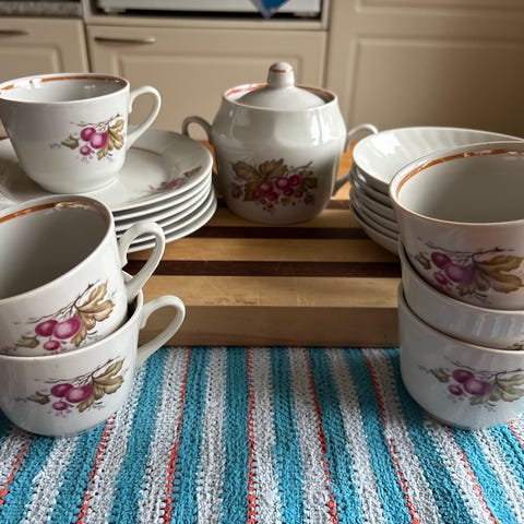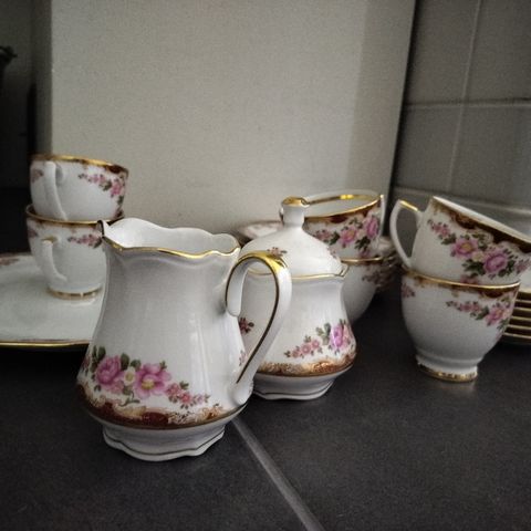 Tsekkiläinen kahviastiasto. 11 kuppia tasseineen ja leivoslautasineen, kahvikannu, sokerikko ja kermakko.