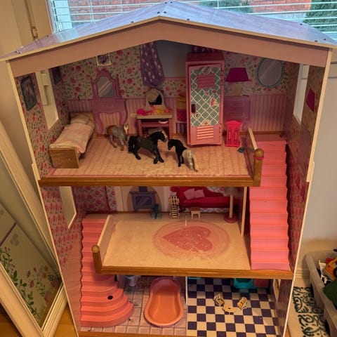 Iso nukkekoti avattavalla seinällä ja katolla. Siistissä ja ehjässä kunnossa. Pieniä kulumisen jälkiä. Pyörät asennettu pohjaan, jotta liikuttelu helpompaa. Sopii erinomaisesti esim schleich asukkien kodiksi. Materiaali taitaa olla mdf.