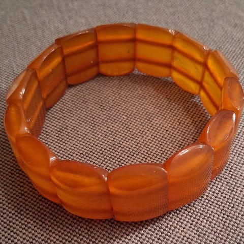 Vanha meripihkarannekoru. Leveys n. 2 cm joustavalla nauhalla.