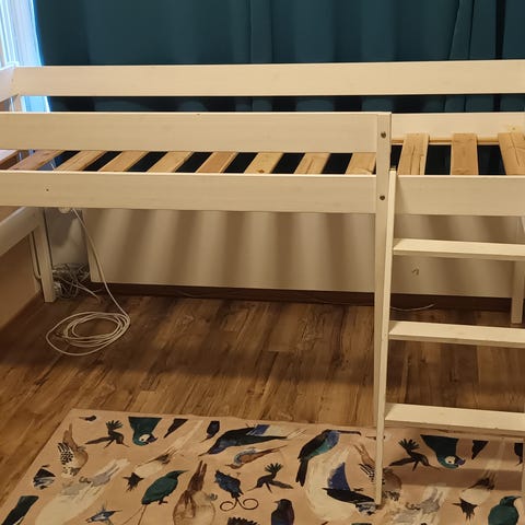 Myydään Jyskin tukeva, puinen Vestervig -parvisänky. Mitat leveys 97 cm, korkeus 180, pituus 202. Yläreunassa kaksi kapeaa hyllyä "yöpöytinä" kiinni, jotka saa halutessaan mukaan. Käytetty noin 5 vuotta. Joitain käytön jälkiä löytyy mutta yleisilmeeltään siisti.