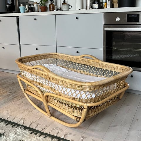 Rottinkinen vauvan kehto, kunto on hyvä ja kehto on tukeva.