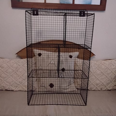Metallirunkoinen hylly, jossa rosteriset tasot. Kahdessa jalassa pyörät niin liikuttelukin mahdollista.