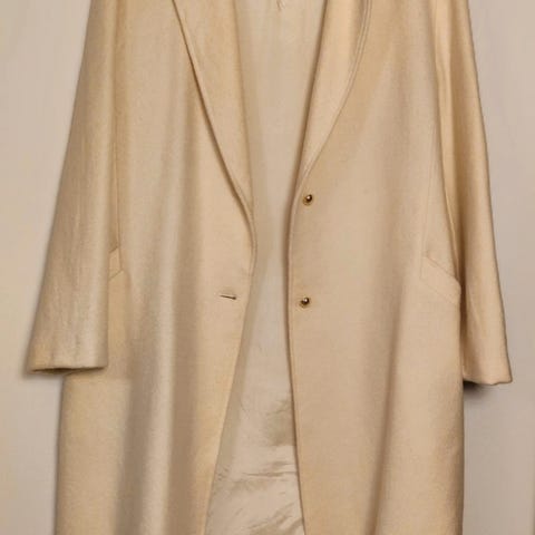 Klassinen ja ajaton, ryhdikäs kaksrivinapitettu malli, takana muotoa tuo naisellinen leikkaus ja tamppi ristiselällä. Materiaali- ja kokolappu irronneet, mutta materiaali on villavoittoinen ja koko reilu koko M-L.