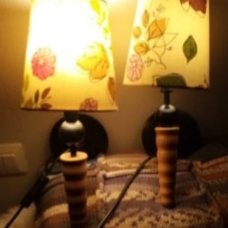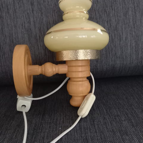 seinä lamppu pistokkeilla, on/off nappula johdossa. musta/kulta. iso kantainen polttimo.