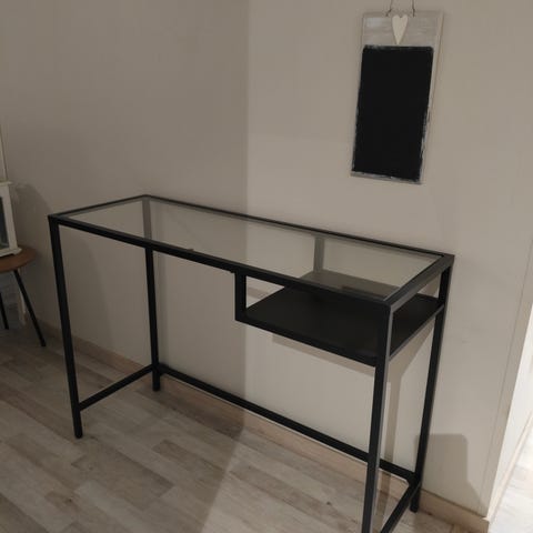 Suhteellisen pieni ja näppärä työpöytä, jossa päälliosa lasia. Hyvässä kunnossa ja kevyt.
