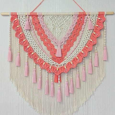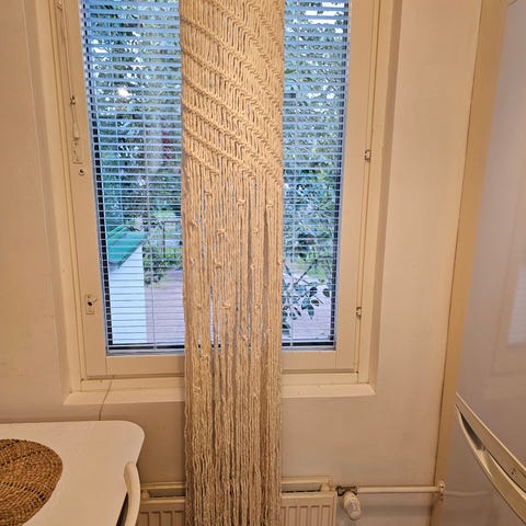 Noin metrin korkea makramelangasta tehty kuusi ja patterivalot. Vaikka lastenhuoneeseen, lemmikkikotiin tai pieniin tiloihin.
