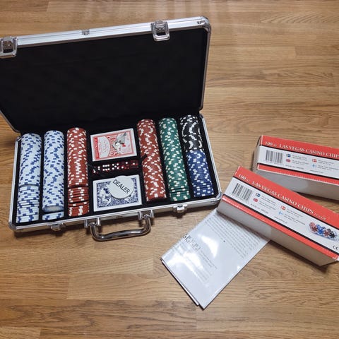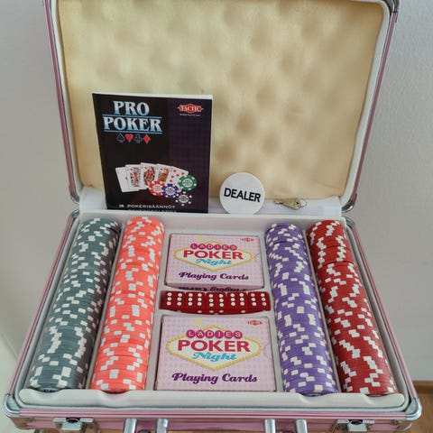 Sisältää pelimerkit, jakajan merkit, käytetyt ja käyttämättömät pelikortit. Salkun käytön ja kulumisen jälkiä.