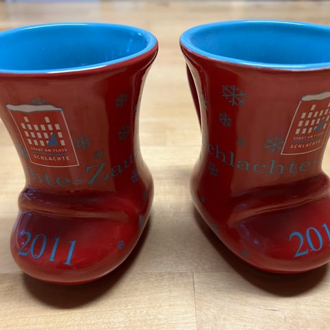 Kauniit glögimukit Saksan joulumarkkinoilta. Saappaan malliset, vetoisuus 0,2 l.