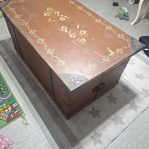 Komea puinen vanha arkku myytävänä. Vetimet tallessa. Lukitussalpa löytyy. Rakenteeltaan kaikin puolin ehjä. Yhdestä nurkasta puuttuu pieniä paloja. Arkun sisällä säilytetty liinavaatteita ja samaan aikaan käytetty koin karkoitusainetta. Tämä tuoksu läsnä nyt, mutta hälvenee pikku hiljaa.