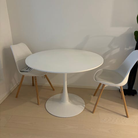 Valkea Iskun pyöreä ruokapöytä, halkaisija 110 cm, tukeva jalka vaalean harmaata metallia sekä 6 tukevaa vaaleaa tuolia. Kaikki lähes uuden veroisia. 6 tuolia mahtuu pöydän ympärille.