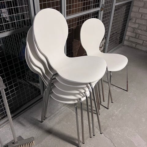Valkoiset muoviset tuolit, joissa on puujalat. Setti sisältää neljä kappaletta. Tuolien istuinosassa on käytön jälkiä, jotka näkyvät kuvissa.