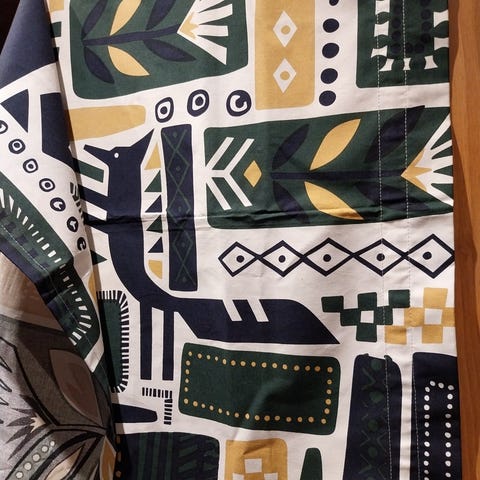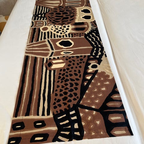 Marimekko Ulappa niminen kappa tai verho. Kaksi kankaanleveyttä, ei ole ommeltu yhteen. Yhden koko 145 x 68 cm. Uudenveroinen. Ei ole pesty. Ripustusnauha / rypytysnauha toimii kiinnitystapana. Virheetön. Yhteishinta.