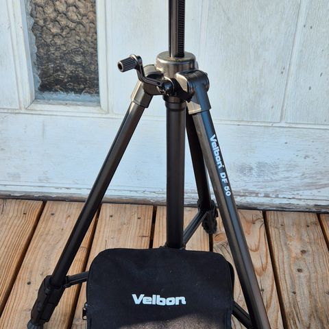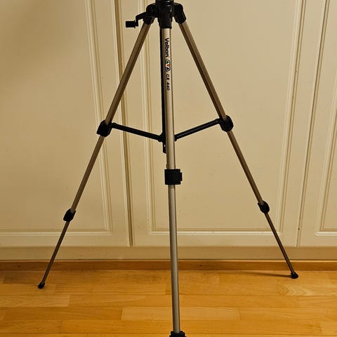 Kevyt alumiininen kamerajalusta ja kuljetuspussi. Hyväkuntoinen, toimivat mekanismit. Yhdessä jalassa maalarinteippiä nimilappuna; teippi on kivettynyt jalustaan kiinni, eikä enää irtoa siististi.