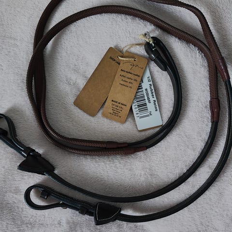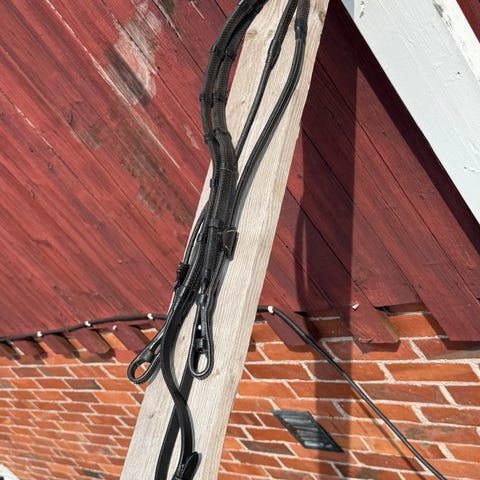 Dyonin mustat kumiohjat koossa Full ja Stübbeni Anatomic loose ring - 13,5cm/16mm kuolaimet. Myyn mieluiten molemmat yhdessä. Molempia käytetty muutama kerta, myyn hevosen menettämisen vuoksi. Maksan postimaksut Suomeen.