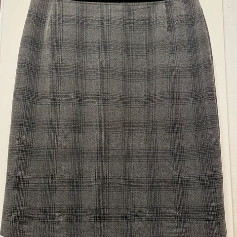 Voglian vuorellinen harmaa hame, edessä pitkä vetoketju, takana pieni halkio. Pituus 60 cm.