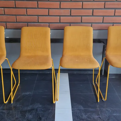 Mustat metalliset jalat, siniharmaa kangas istuinosassa ja puinen selkänoja. Siisti kunto, joitakin käytön jälkiä.