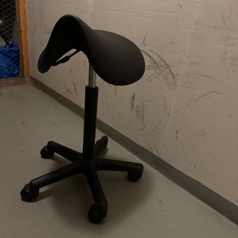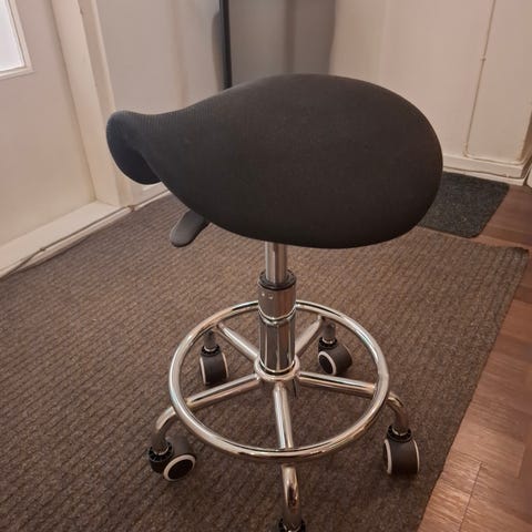 Oiva-merkkinen, hyväkuntoinen ja ergonominen satulatuoli. Korkeussäätö, rullat ja tukeva selkänoja. Sopii hyvin työpisteelle tai kotitoimistoon.