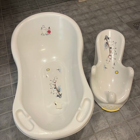 Muumiaiheinen vauvan ja pienten lasten kylpyamme tulpalla. Mukana myös kylpytuki, joka helpottaa pienen vauvan pesua.