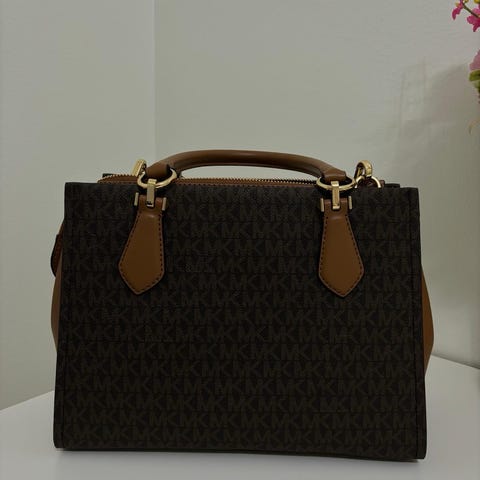 Michael Kors nahkainen naisten laukku ruskeassa värissä. Laukussa on olkahihnat ja sisätilat, jotka sisältävät vetoketjutaskun ja muita säilytystiloja. Väri on upea ja glamour