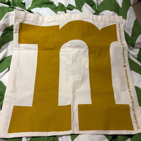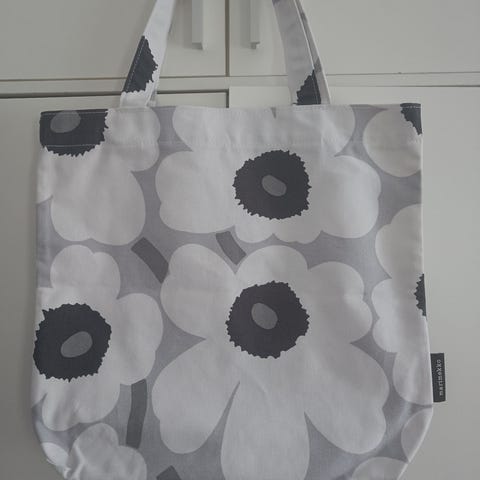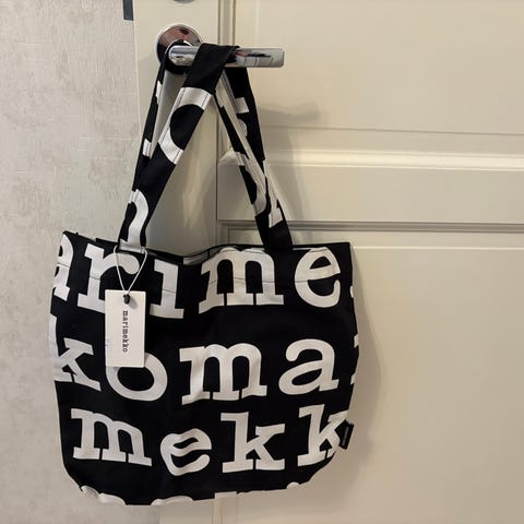 Marimekko Notko Logo kangaskassi, uusi. Kassi on valmistettu kankaasta ja siinä on mustavalkoinen kirjainkuvio.