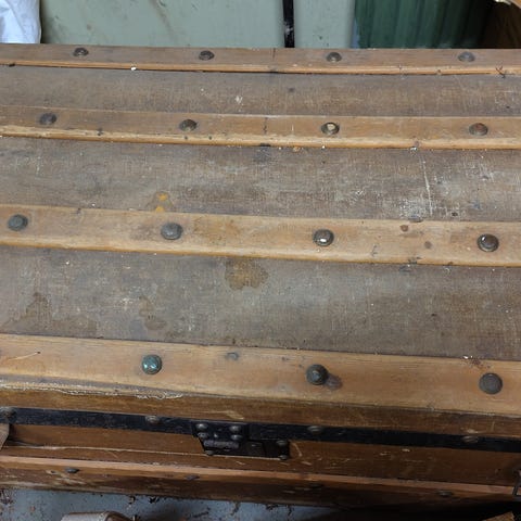 Myydään vanha puurunkoinen matka-arkku / matkalaukku, kauniisti patinoitunut.
