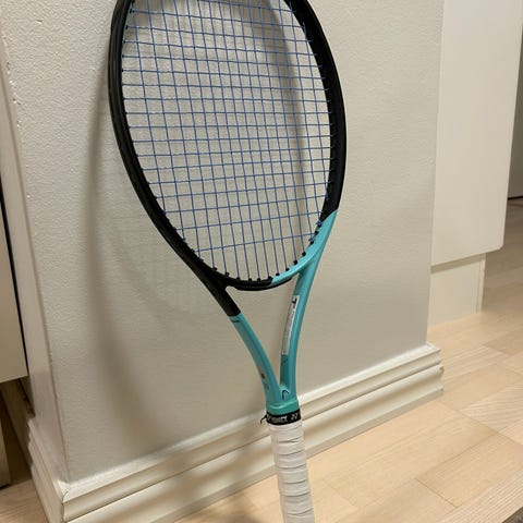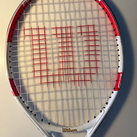 Kahdesti kentällä käynyt juniorien tennismaila. Myös grippi hyvässä kunnossa. Suojapussukka mukaan.