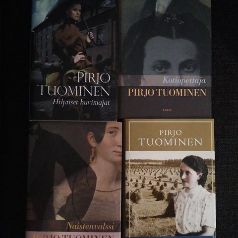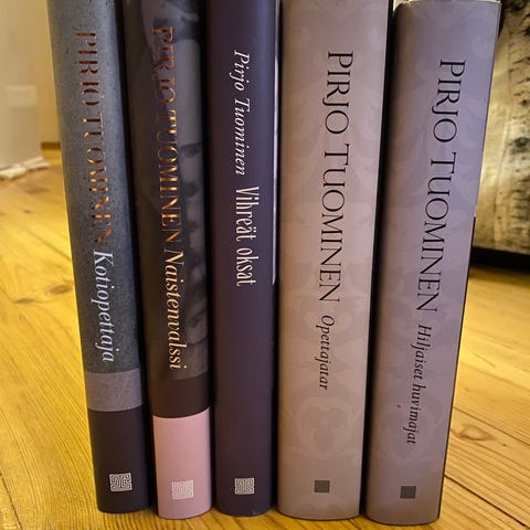Pirjo Tuominen -kirjat. Ensimmäinen vihreällä kannella, toinen vaaleanpunaisella kannella. Kirjat ovat suomenkielisiä.