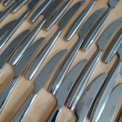 Hackmanin Carelia voileipäaterimet. Vetisissä pieniä käytön jälkiä. Veitsen pituus 18 cm ja haarukan 15,5 cm.
