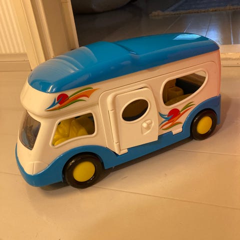 Matkailuauto setti. Sisältää asuntoauton ja asuntovaunun. Molempiin pääsee sisälle leikkimään pienillä figuureilla.