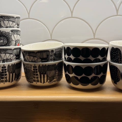 Myynnissä Marimekko- astiasto: 2 kulhoa, 1 pieni kulho, 1 iso tarjoiluvati, 4 lautasta. Melamiinia (konepesun kestävä, EI mikroaaltouunin kestävä).