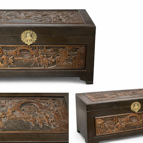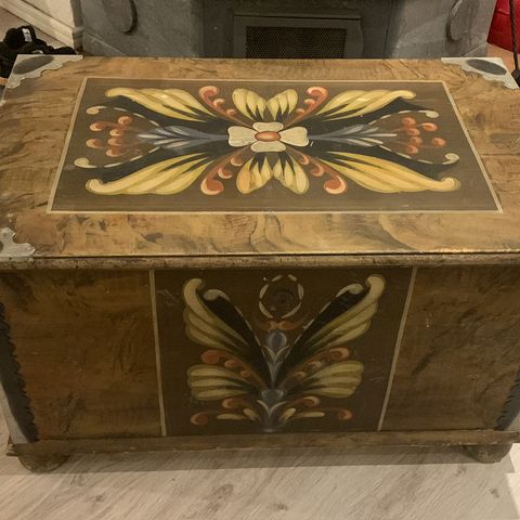 Myydään käsin veistetty puinen arkku, runsaalla reliefikoristelulla.