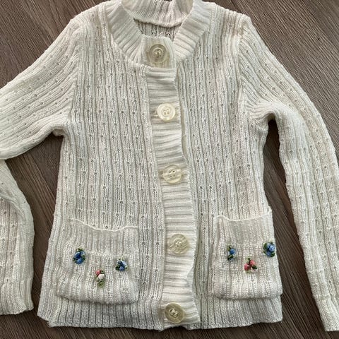 Beige neuletakki, jossa on isot kaulukset. Paidasta puuttuu tuotemerkki sekä kokolappu. Neule vastaa noin kokoa 98. 100% puuvillaa.
