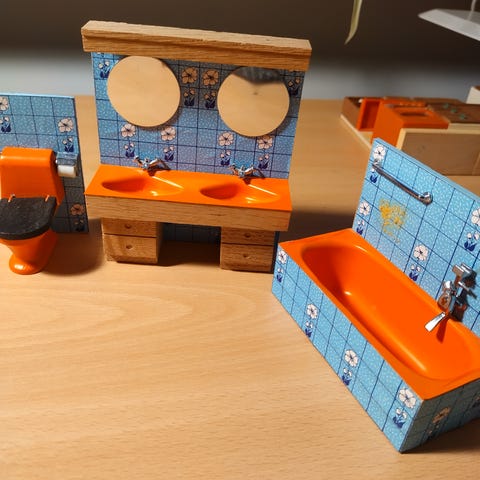 Hyväkuntoiset kalusteet ja asukkaat nukkekotiin