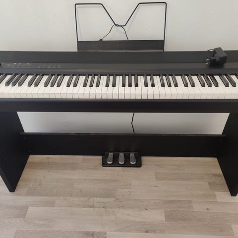 Yamaha Clavinova sähköpiano ja pianotuoli. Ruskeaa puuta.