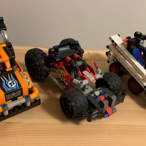 LEGO Technic rakennussarja, joka sisältää punaisen ja sinisen värisiä osia. Sarja sisältää yksityiskohtaisen auton rungon, istuimet, ohjauspyörän ja pyörät. Rakennussarja tarjoaa teknisiä ominaisuuksia kuten 4 vaihdetta ja jousituksen.