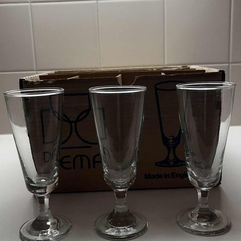 Valkoviinilaseja on ainoastaan käytetty kerran ja näistä yksi tippui lattialle ja särkyi.