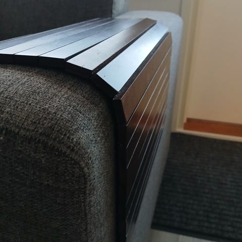 Muotoutuva käsinojatarjotin on kätevä apu moneen arkiseen tilanteeseen. Se toimii tarjoilualustana esimerkiksi rahin päällä avattuna ja taipuu sohvan käsinojalle pieneksi apupöydäksi. Materiaali on massiivikoivua ja saatavana on useita värejä, joista löytyy varmasti sopiva omaan sisustukseen. Materiaali massiivikoivua, taustakangas puuvillaa. koko: 60x35 cm