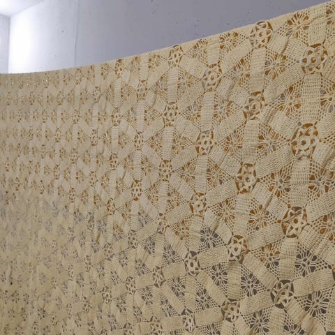 Kaunis valkoinen / luonnonvalkoinen virkattu pitsi päiväpeitto. Melko kellastunut, voi varmaan valkaista.
