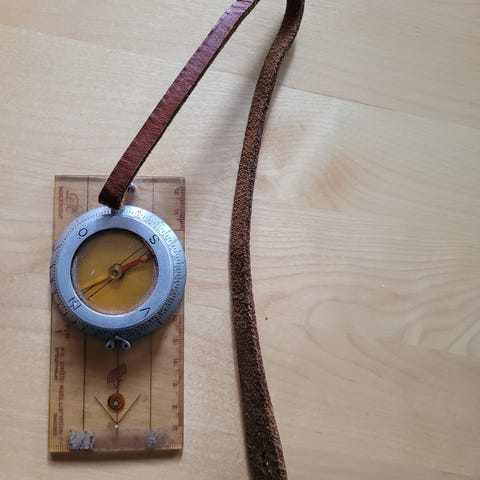 Kompassi, jossa on lisäksi suurennuslasi, vatupassi sekä 1:20 000 ja 1:15 000 mitat reunoilla. Postit lisätään.