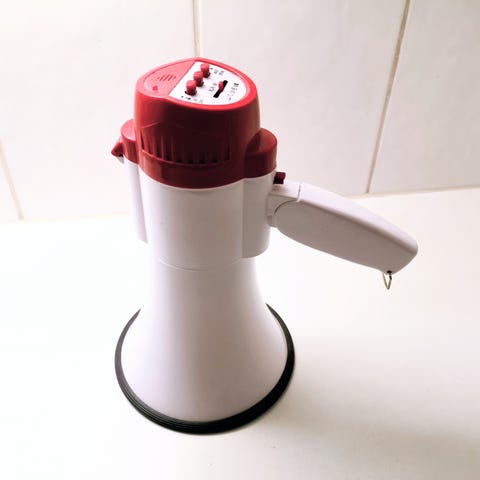 Megafoni. Todella kovaääninen. Voimakkuus säädettävissä.
