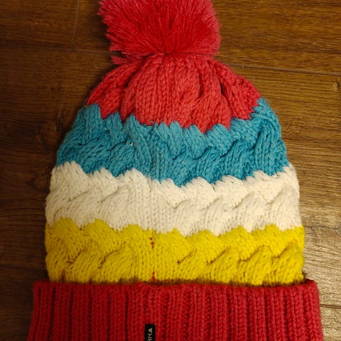 Paksusta langasta tehty Börjesson-myssy. Vuori ja "letit". 30% villaa, 70% akryylia, vuori 100% polyesteriä. Koko S/M. Käsinpesu. Mieluiten nouto, käteisellä.