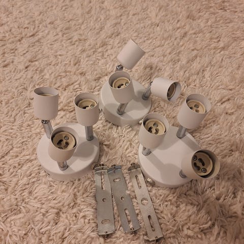 Kolmen spotin hyväkuntoinen kattovalaisin. Jokainen spotti erikseen säädettävissä. Leveys noin 74 cm ja korkeus noin 19 cm. Mukaan kolme GU10 polttimoa, jotka kiinni lampussa. Testattu toimivaksi.
