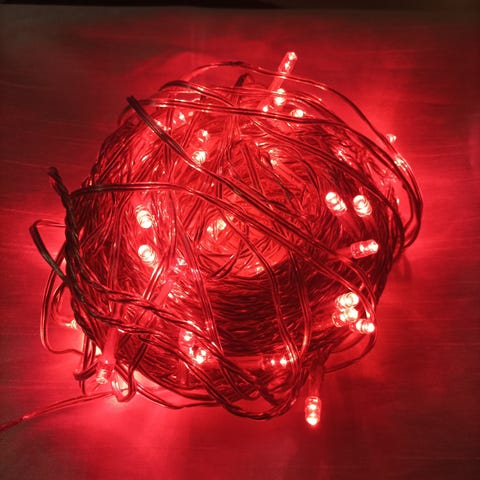 Valkoisen ja punaisen värinen pitkä valoketju muuntajalla. Käytetty ehkä parina talvena, yksi lamppu ketjusta ainakin palanut, ei vaikuta käyttöön