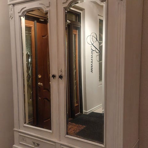 Myynnissä muuton vuoksi näyttävä, vanha puinen vaatekaappi, jossa kauniit koristelistat ja keskellä kokovartalopeili.